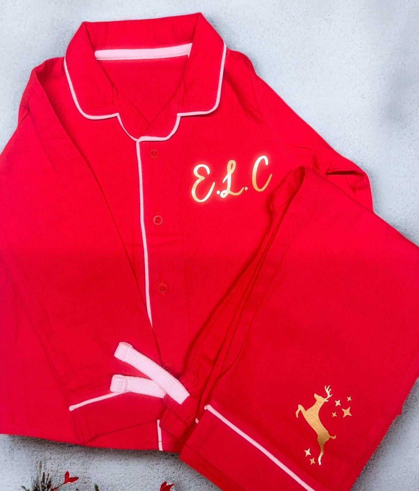 Make Christmas morning even more magical with our customisable pyjamas, crafted from 100% brushed cotton for cosy comfort. Each set is fully personalised with your child’s name printed across the back and their initials on the front—creating a festive, one-of-a-kind look they’ll love.”