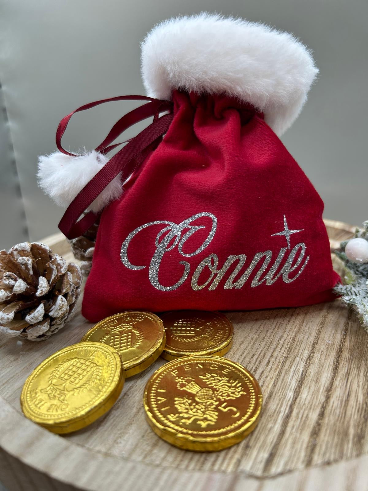 A small, 16 x 11.5 cm, velvet treat bag for hiding those Christmas goodies away, personalised with your name.